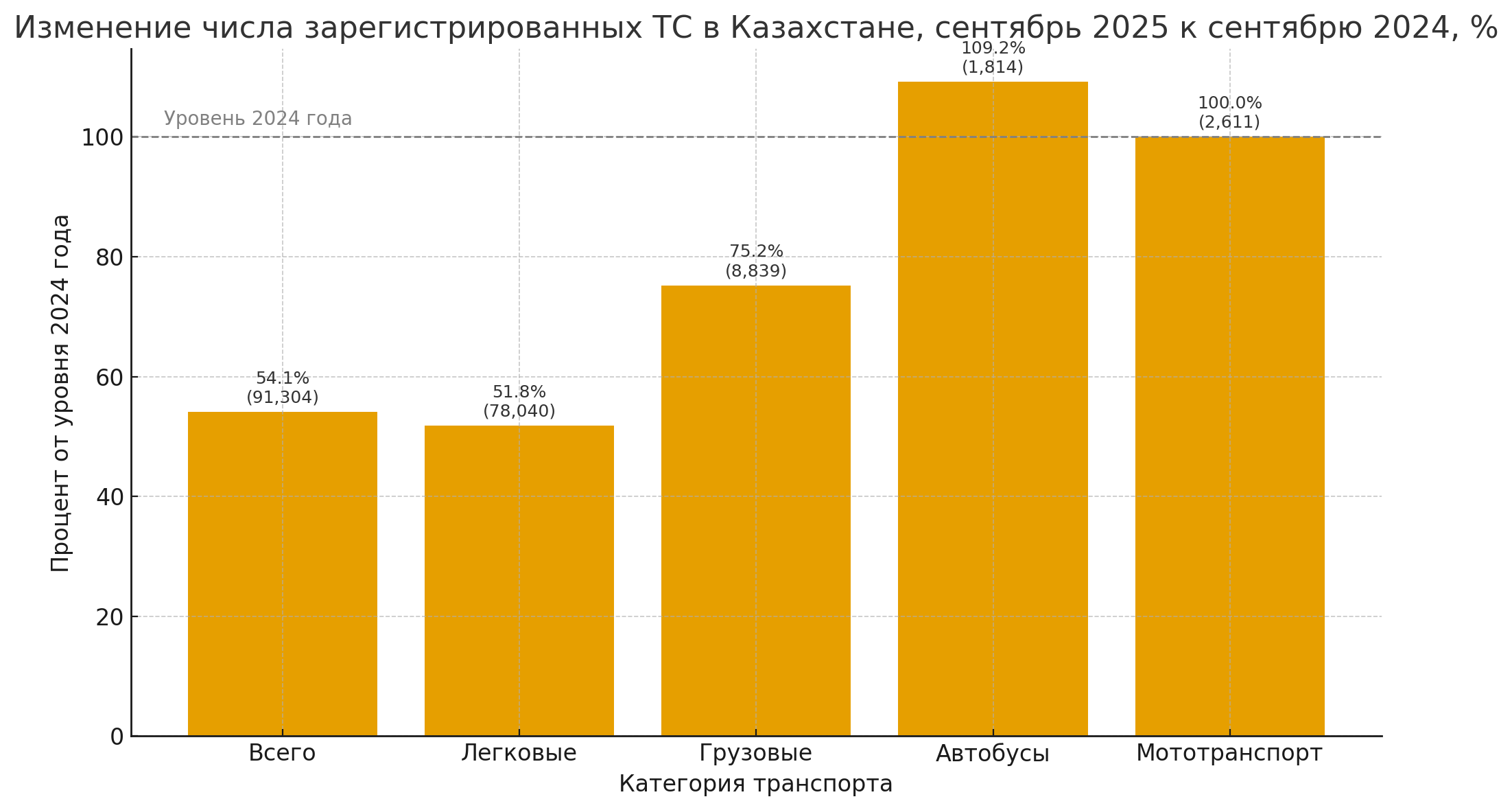 «В сентябре 2025 года общее число транспортных средств, поставленных на учет, составило 91 304 единицы. Значение в 54,1% означает, что за год регистраций стало заметно меньше — почти вдвое, по сравнению с сентябрем 2024 года», — отмечают в Бюро нацстатистики РК.