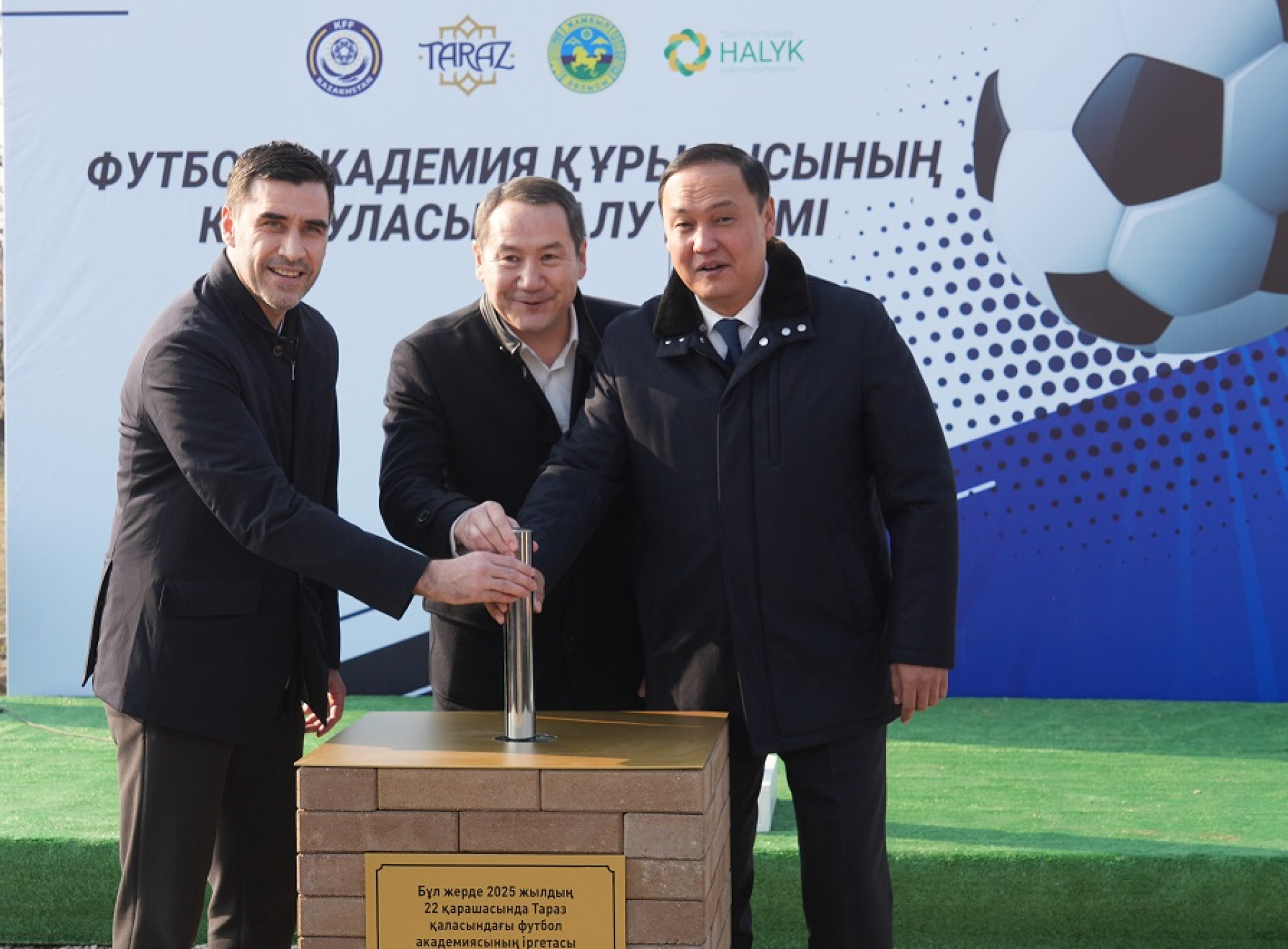 В Таразе заложили капсулу будущей футбольной академии. Объект возводится в рамках трёхстороннего меморандума между акиматом Жамбылской области, Казахстанской федерацией футбола и Фондом Halyk Тимура Кулибаева.